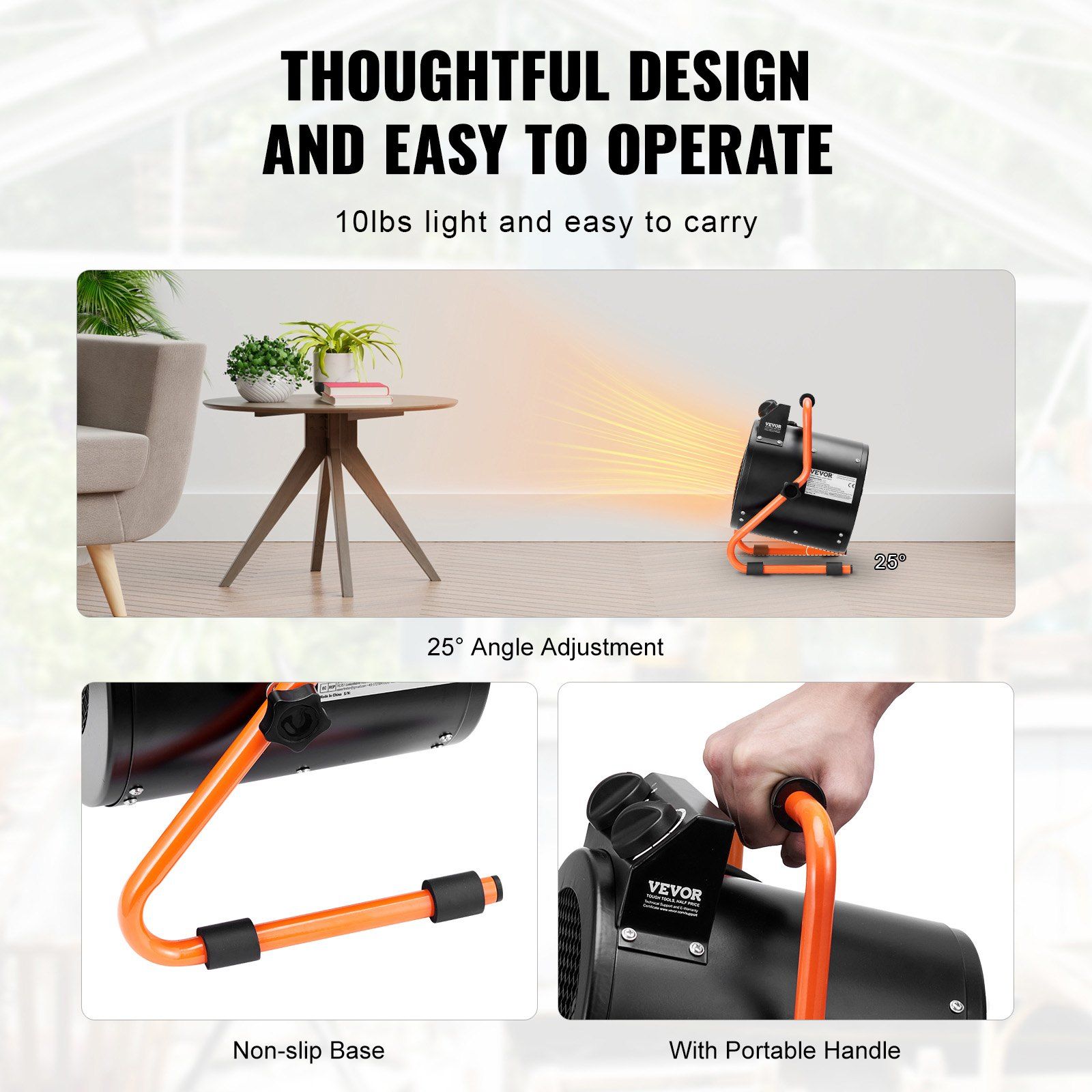 5.Portable and Lightweight: Our greenhouse heater is thoughtfully designed for easy operation, weighs less than 10 pounds, and comes with a portable handle. It can be adjusted to a 25° angle with a stable anti-slip base, allowing you to move it to different locations for use anytime, anywhere.