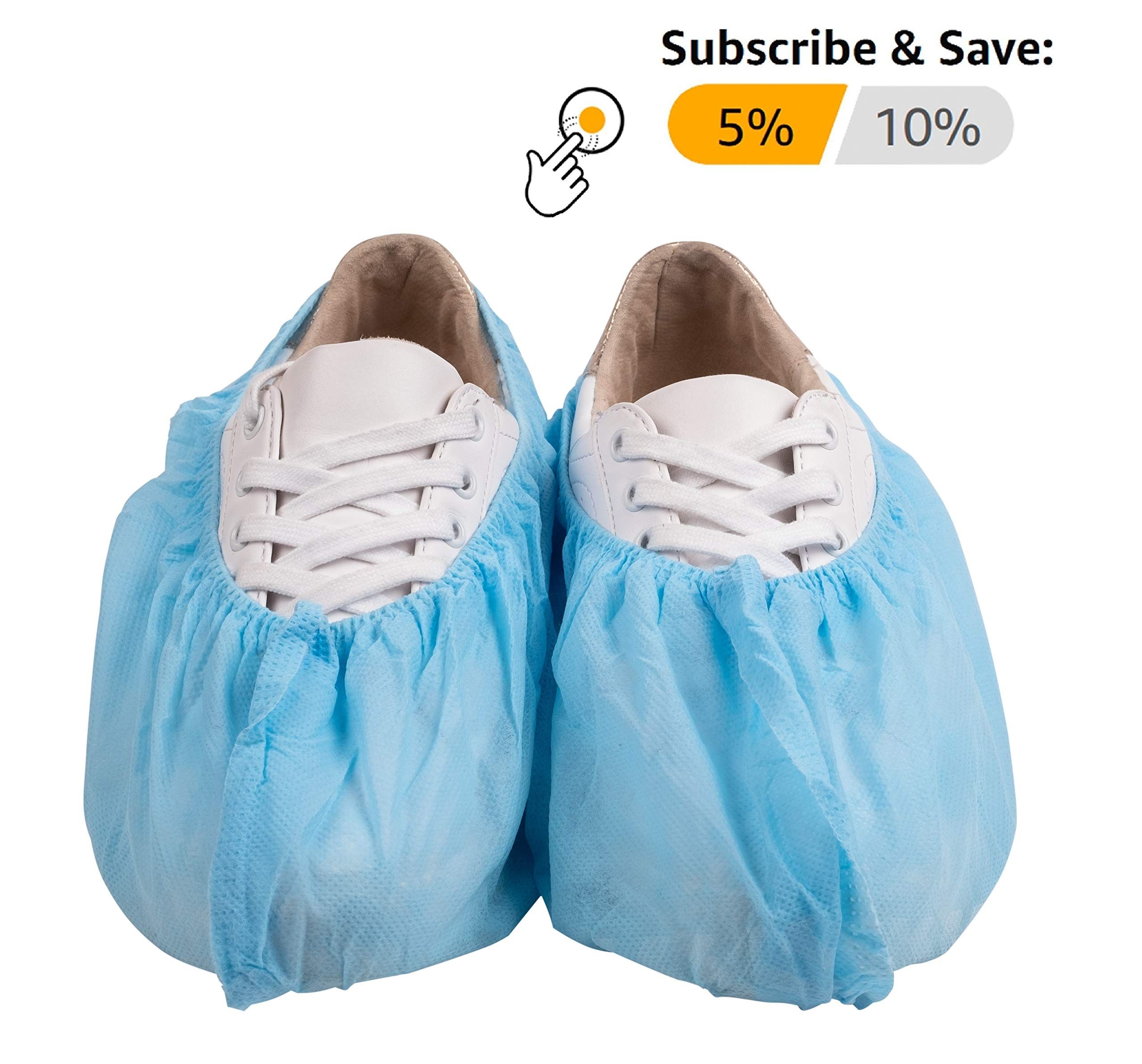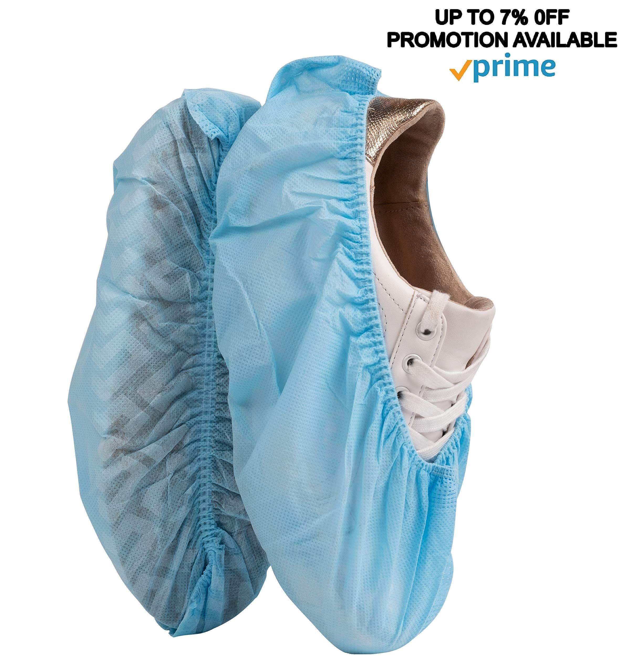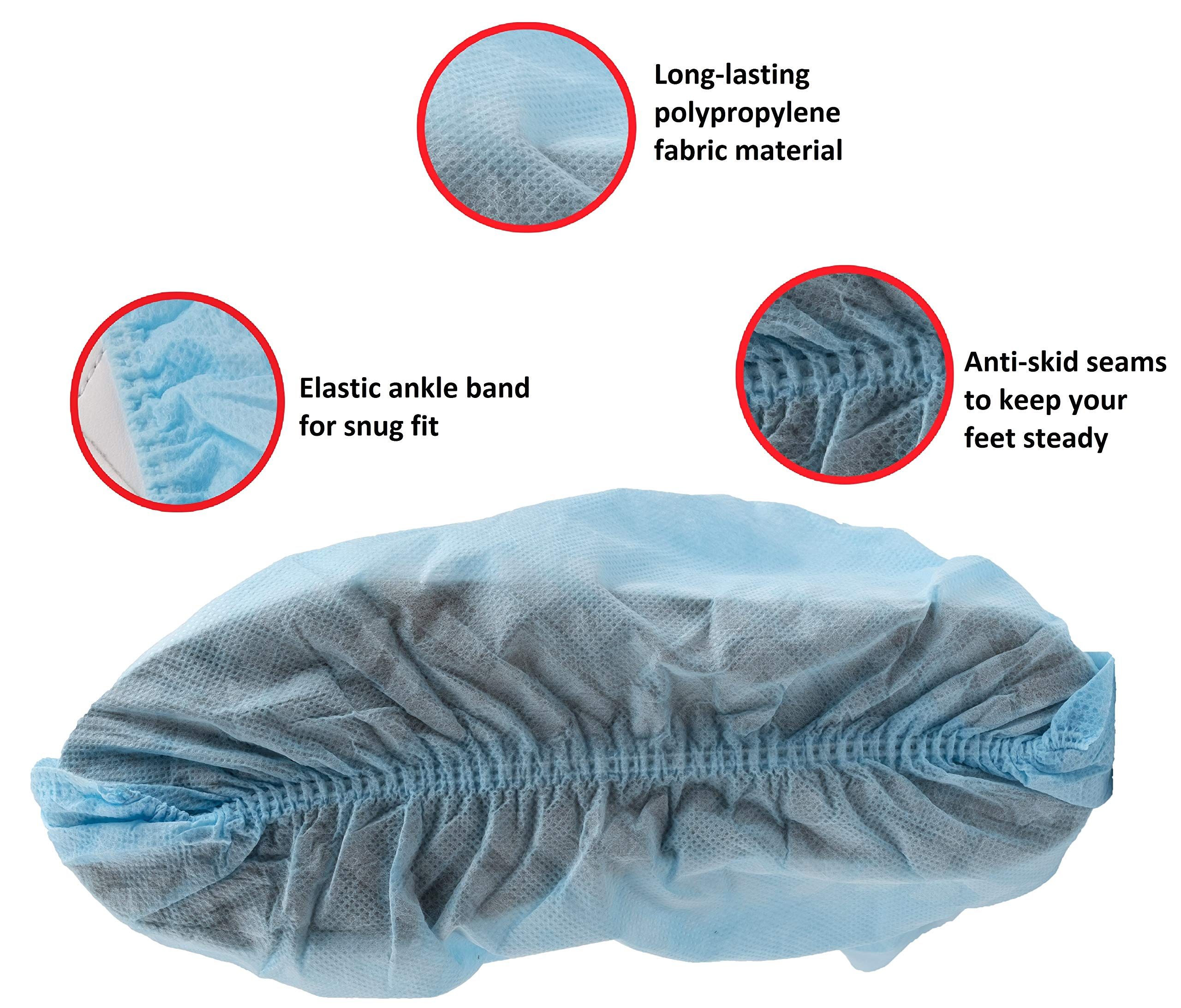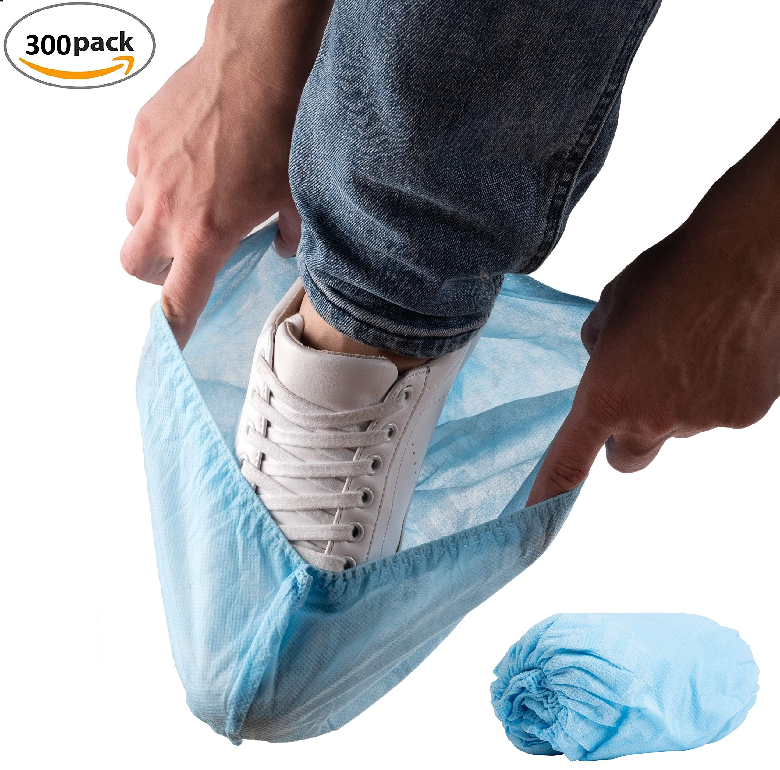 1.PREMIUM QUALITY: Pack of 300 Disposable shoe covers are the most and effective option to keep your shoes dry and protected. Blue covers are suitable for all kinds of shoes. X-Large size. Made from thick, long-lasting polypropylene fabric with an anti-slip, coating on the sole our boot covers resist tearing and rupturing. Elastic ankle band provides snug and comfortable fit around shoes. Easy-on and easy-off, breathable and lightweight.