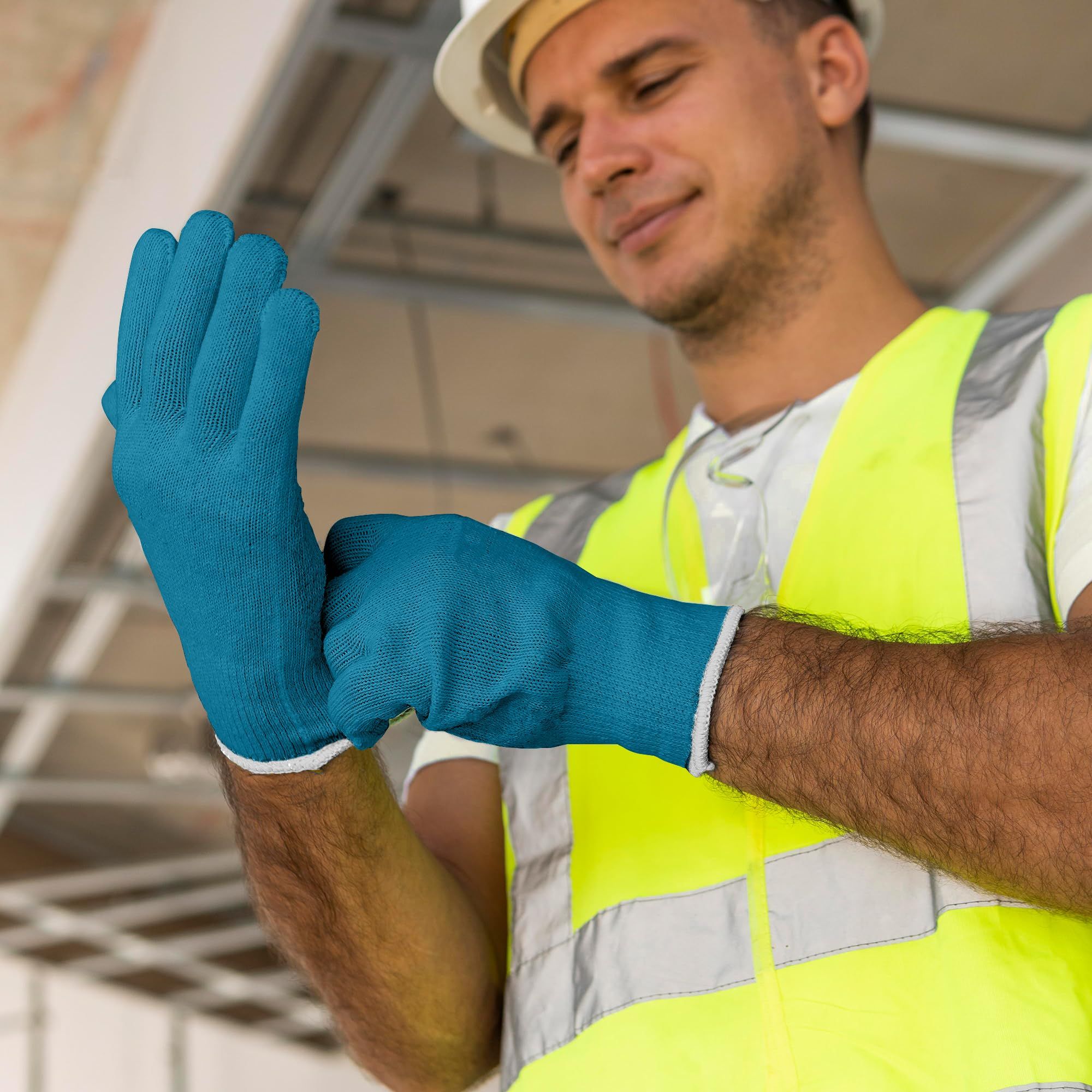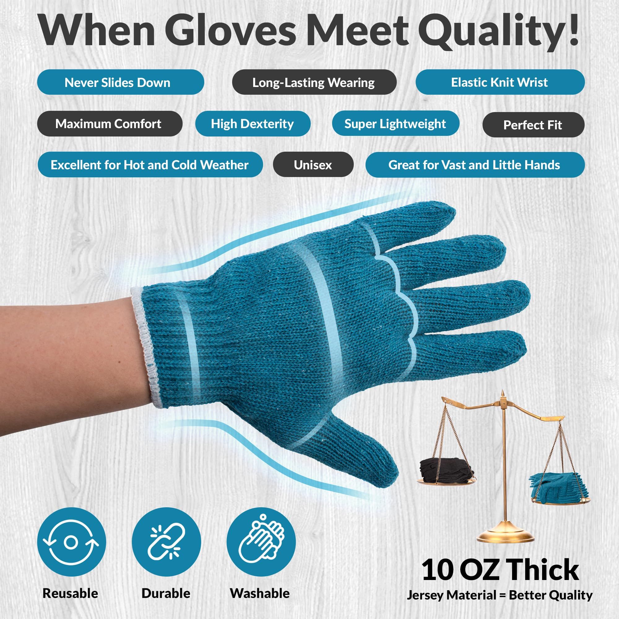 1.Pack of 24 Large Cotton String Gloves, 10 Inch. Our breathable blue gray cloth work gloves are made of 60% cotton and 40% polyester. Thanks to this high-quality fabric blend, roping gloves for men are light and durable.