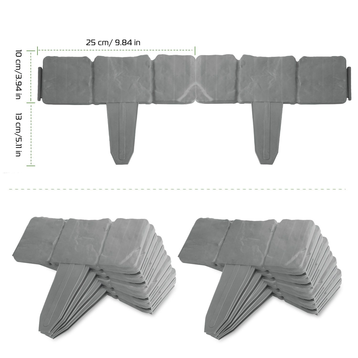 • *Custom Edging Length*:20 pieces make for a 5 meter/16 feet long edging that’s ideal for fencing small flowerbeds,walkway,greensward,etc. You can also easily connect another pack to make 10 meters or even longer to fit your garden requirements.